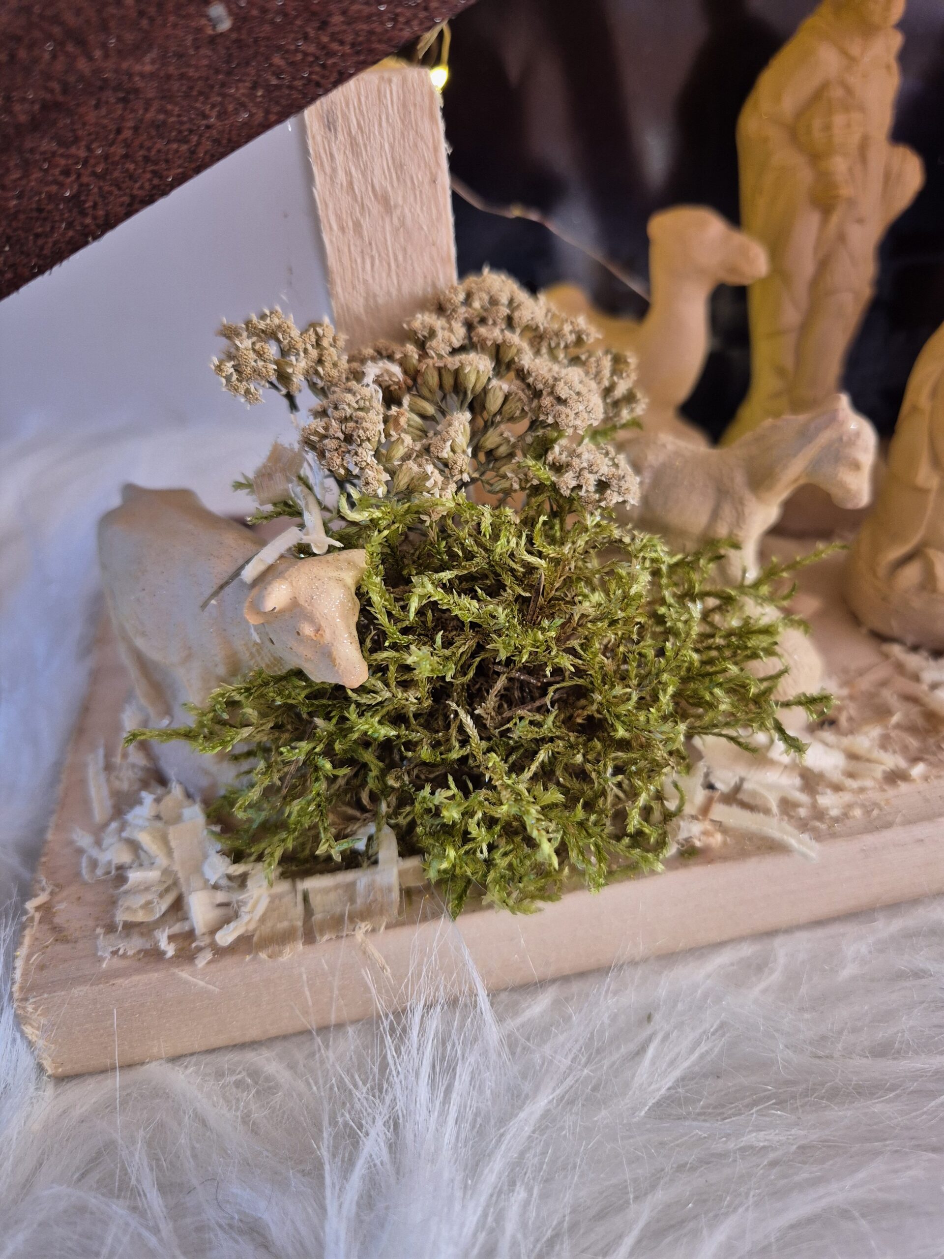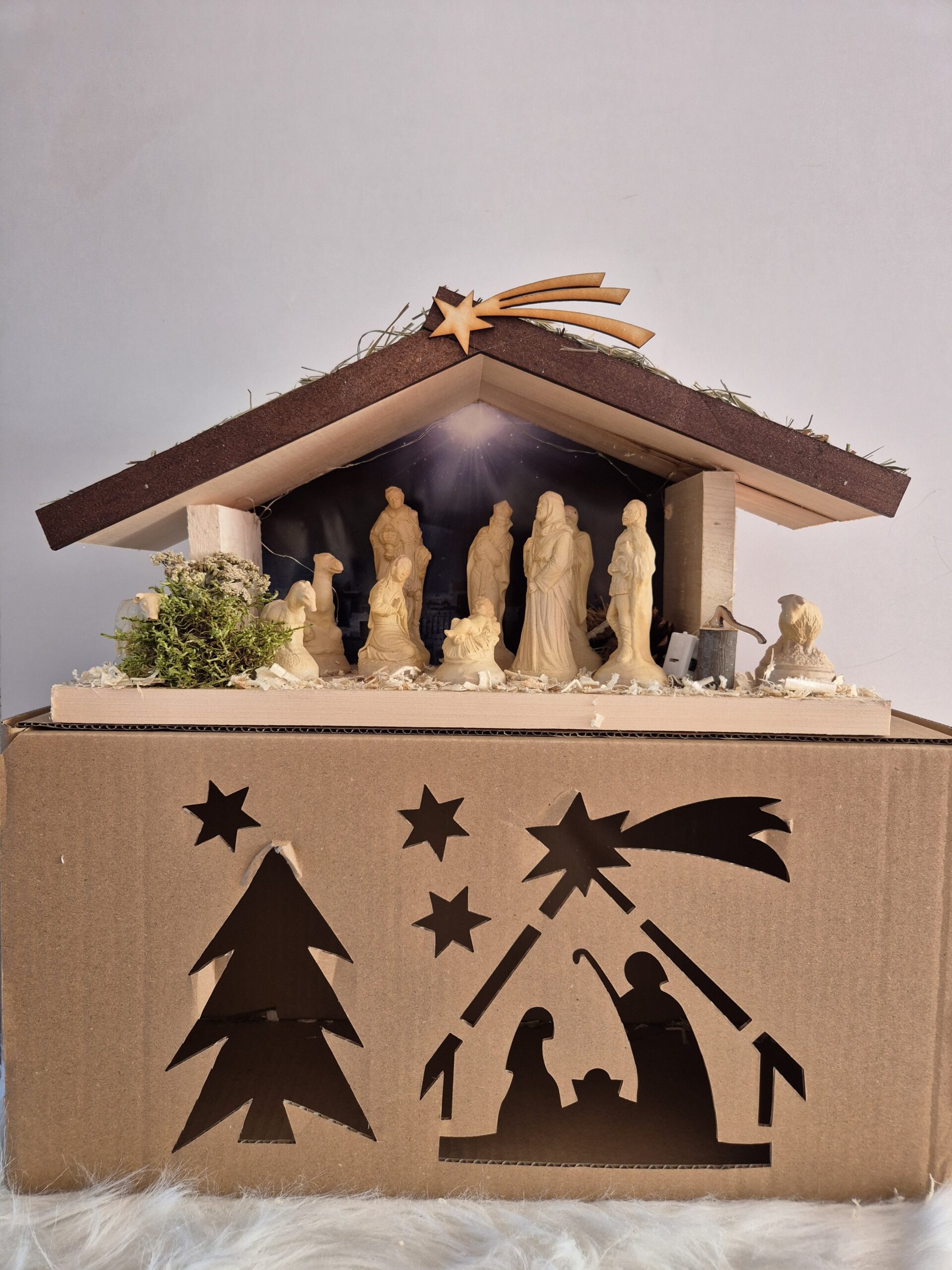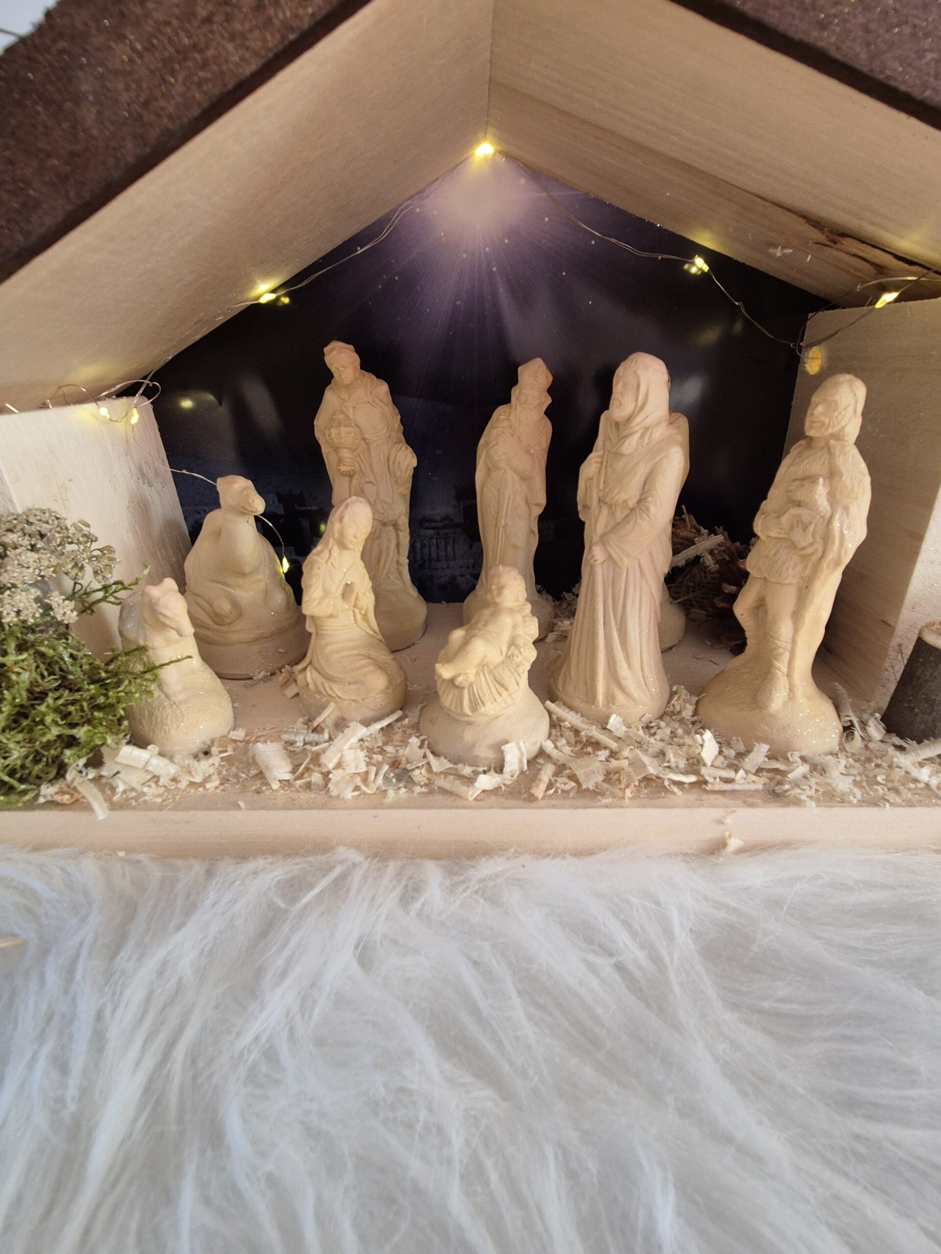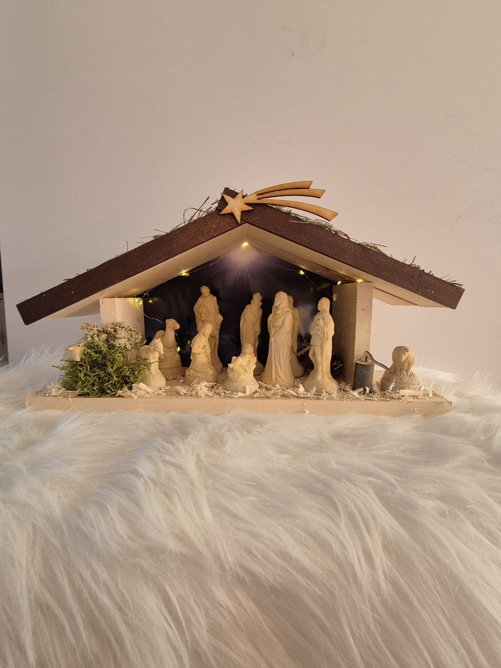 Szopka została ręcznie wykonana z wysokiej jakości drzewa, ekologicznej słomy, figurki zostały wykonane z gipsu. W zestawie lampki na druciku , instrukcja montażu lampek oraz solidne pudełko kartonowe, dzięki któremu można bezpiecznie przechowywać szopkę.