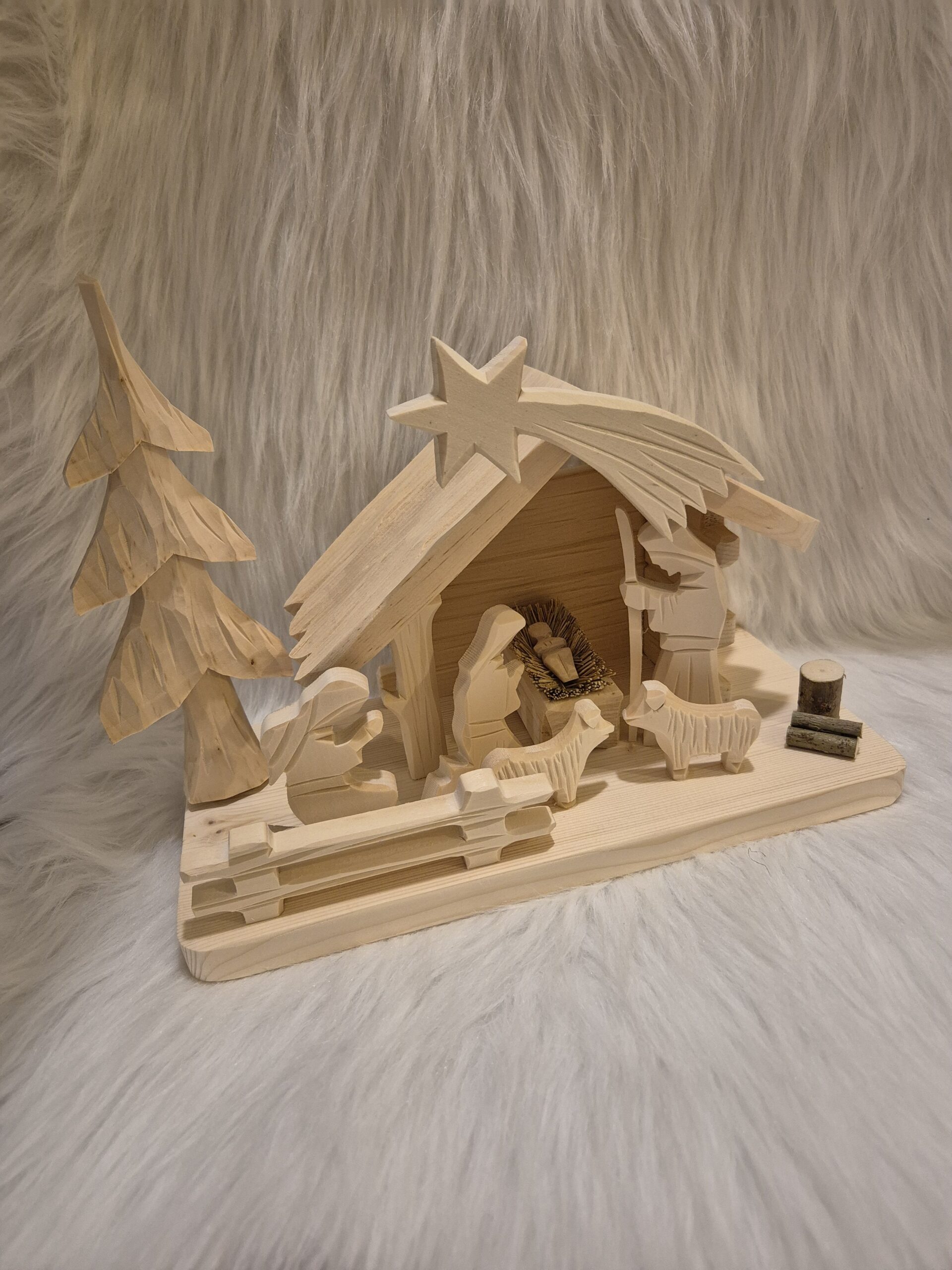 Każda z figurek i każdy detal jest ręcznie rzeźbiony. Scena przedstawia narodziny Jezusa z Maryją, Józefem , pastuszkiem oraz zwierzętami.